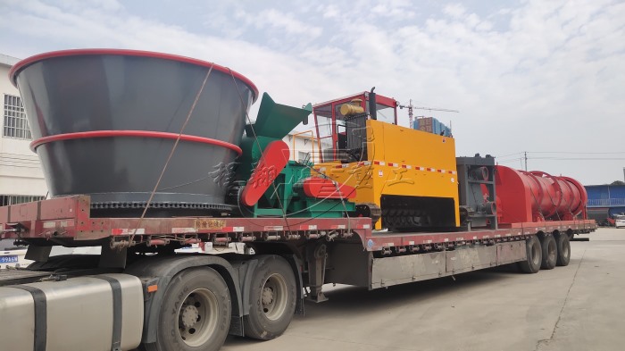 由于該豬糞秸稈有機(jī)肥料生產(chǎn)線(xiàn)產(chǎn)量較大,因此分為多車(chē)裝置運(yùn)輸。主要的豬糞加工設(shè)備有:大型秸稈粉碎機(jī)、履帶式翻堆機(jī)、臥式攪拌機(jī)、新型三合一造粒機(jī)、不同型號(hào)的滾筒篩分機(jī)以及多個(gè)型號(hào)的烘干冷卻設(shè)備。