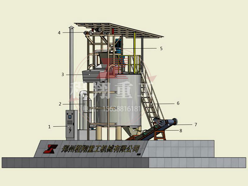 上圖為:有機肥好氧立式發(fā)酵罐。1-配電柜,2-光氧除臭設備,3-上料斗,4-提升滾輪,5-電機,6-樓梯,7-移動皮帶輸送機,8-下料口