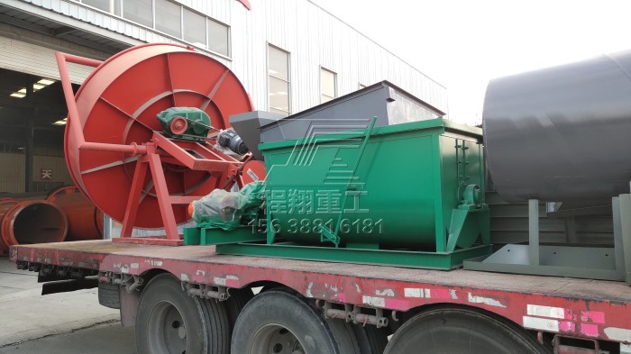 本次發(fā)貨的豬糞有機肥生產線主要設備有:鏟車喂料、臥式攪拌機、有機肥濕法造粒機、滾筒篩分機以及烘干設備。BB肥攪拌機作為拋圓設備使用