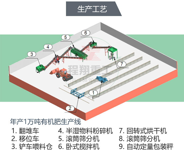 查看 > 13 2020/10本次發(fā)貨的設(shè)備是程翔重工是為江西某客戶定制的,簡單的年產(chǎn)1萬噸雞糞有機肥生產(chǎn)線,主要設(shè)備有:鏈?zhǔn)椒鬯闄C、滾筒篩分機、濕法攪齒造粒機、鏟車喂料倉以及自動包裝秤。改雞糞生產(chǎn)線的工作流程為:發(fā)酵——粉碎——攪拌——造粒——篩分——包裝運輸1.發(fā)酵是第一步,畜禽糞便含有大量病蟲卵,需要進