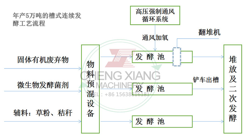 如工藝流程圖所示,每天將畜禽糞便等固體有機廢棄物與秸稈等輔料混合物及發(fā)酵菌劑充分混合,用鏟車均勻地送入發(fā)酵池前端(原始空池前端1/8或翻倒完騰出的池前端1/8),發(fā)酵物料在池內(nèi)堆積厚度為1.5~1.8米,靠高壓風(fēng)機強制通風(fēng)和翻堆時物料與空氣接觸提供的氧氣進行連續(xù)好氧發(fā)酵,使發(fā)酵物料快速腐熟、去水、干燥,發(fā)酵周期7-8天。在翻堆機縱橫向行走機構(gòu)的運送下,垂直提升機構(gòu)將發(fā)酵物料從池內(nèi)挖起提升到水平輸送機構(gòu)上,水平輸送機構(gòu)將發(fā)酵物料輸送一段距離(8-10米)后落入池中,這樣發(fā)酵物料就在池內(nèi)產(chǎn)生一定的位移,使物料在池內(nèi)有規(guī)律、等距離的漸進式后移,每天從發(fā)酵池尾端將發(fā)酵好的物料(一天的處理量,池長的1/8)用鏟車運走,將發(fā)酵池前端騰出的空間(一天的處理量,池長的1/8)補充新的發(fā)酵物料,從而形成了一種連續(xù)的發(fā)酵過程。發(fā)酵翻堆過程實現(xiàn)了全自動智能化控制。發(fā)酵后的物料堆成料堆儲存的同時進行二次發(fā)酵,進一步腐熟并去除部分水分。堆制一段時間(根據(jù)生產(chǎn)任務(wù)及場地決定)后對其進行篩選、磁選去除其中的石塊、鐵件等,調(diào)整水分(曬干或烘干)即可作為粉狀有機肥銷售或用作有機肥造粒原料。