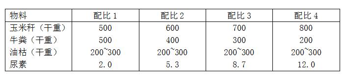 主要選擇資源豐富的軟質(zhì)作物秸稈和畜禽糞便為主,將物料的C/N比值盡可能調(diào)節(jié)到25:1。根據(jù)各地原料的差異,選擇下表中所列物料配比中的一種(其他秸稈和畜禽糞便可參照該比例)。油枯應(yīng)發(fā)酵結(jié)束前10 d左右按比例添加,均勻鋪在發(fā)酵堆上,通過利用臥式粉碎機將油枯與其他物料攪拌均勻,使用槽式翻堆機再堆制發(fā)酵。若加入油枯后堆溫超過60℃,應(yīng)即時翻堆,防止油枯炭化和氨化。