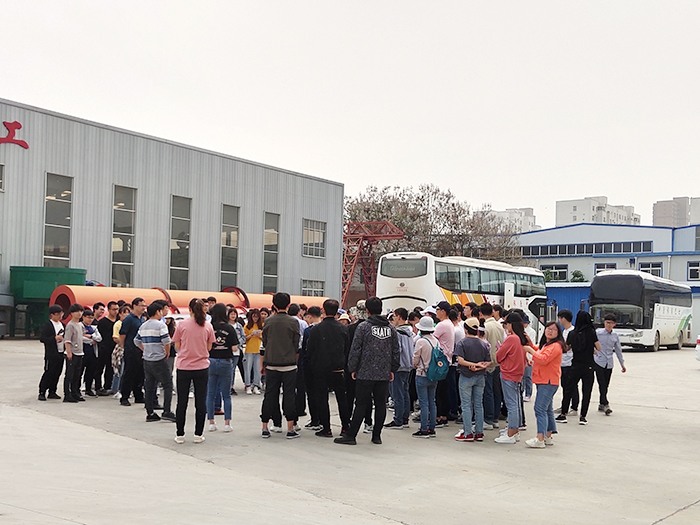 講解員在為師生講解不同型號(hào)的滾筒烘干機(jī)以及冷卻機(jī)之間的區(qū)別