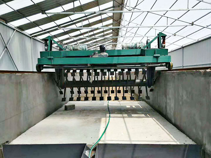 ③優(yōu)缺點(diǎn):行走式翻堆機(jī)采用翻拋齒旋轉(zhuǎn)的翻堆結(jié)構(gòu)與自動(dòng)行走系統(tǒng),翻堆時(shí)可根據(jù)料堆的深度進(jìn)行升降,因此翻堆徹底,效率高,翻堆和輸送同時(shí)完成,機(jī)器邊行走邊翻堆自動(dòng)完成全部工作過程,實(shí)現(xiàn)流水式有機(jī)肥生產(chǎn)。翻堆期間可以使用行走式翻動(dòng)翻堆機(jī),受天氣影響小、占地面積小、周期短、節(jié)省人力,一機(jī)多槽使用,處理能力強(qiáng),操作簡(jiǎn)單自動(dòng)化生產(chǎn),設(shè)備投資成本也相對(duì)較低。缺點(diǎn)是攪拌機(jī)與堆料接觸部分高速旋轉(zhuǎn)易磨損,且與糞便混合物直接接觸容易被腐蝕,需要進(jìn)行維護(hù)和更換。
