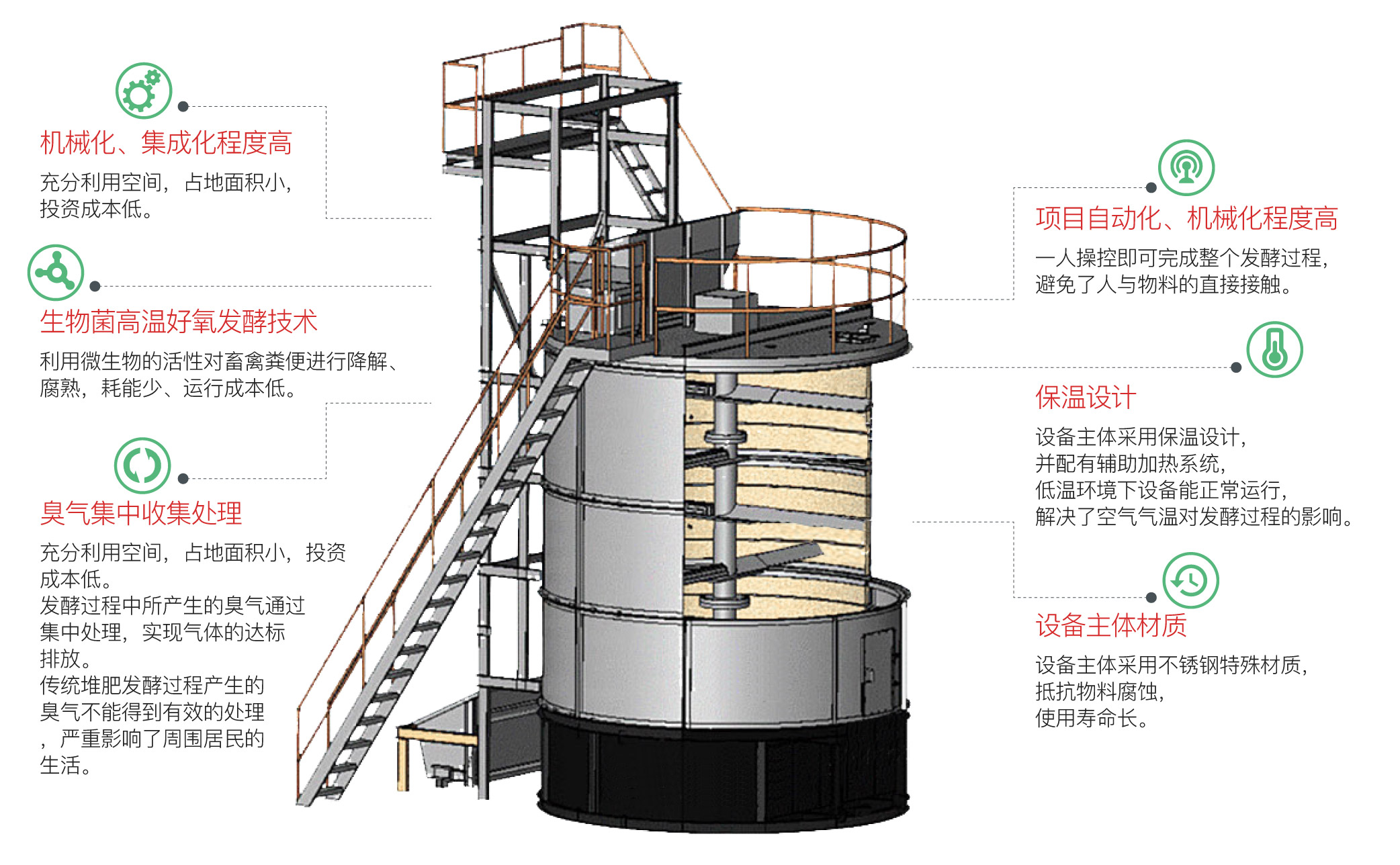 有機(jī)肥好氧立式發(fā)酵罐最大的優(yōu)點(diǎn)是占地面積小,自動(dòng)化、機(jī)械化程度高,用工成本低。對(duì)于土地面積狹小的有機(jī)肥廠比較使用。缺點(diǎn)是能耗較大,設(shè)備投資較高,另一個(gè)就是應(yīng)用范圍受限,一般長(zhǎng)江以北地區(qū)不適用。