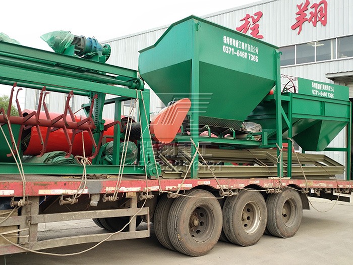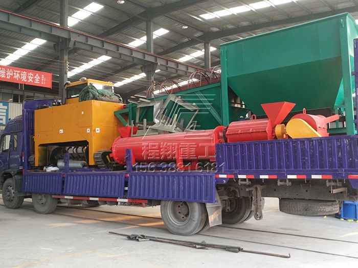 查看 > 20 2020/11由于該豬糞秸稈有機肥料生產(chǎn)線產(chǎn)量較大,因此分為多車裝置運輸。主要的豬糞加工設(shè)備有:大型秸稈粉碎機、履帶式翻堆機、臥式攪拌機、新型三合一造粒機、不同型號的滾筒篩分機以及多個型號的烘干冷卻設(shè)備。滾筒烘干設(shè)備風頭以及風機安置熱風爐以及冷卻設(shè)備多個烘干冷卻設(shè)備履帶式翻堆機以及大型秸稈粉碎機二次烘干設(shè)備滾筒篩分機以及鏟車喂料倉本次豬糞秸稈有機肥料生產(chǎn)線工藝設(shè)計流程為:利用大型秸稈粉碎機將稻草秸稈等粉碎均勻,